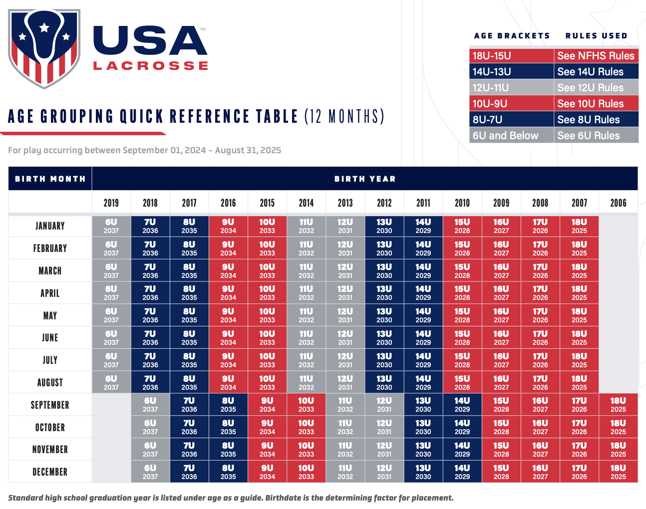 The league follows the USA Lacrosse Age Chart. USAL membership is required for all players and coaches. https://www.homegrownlacrosse.org/gnll-reqs-resources